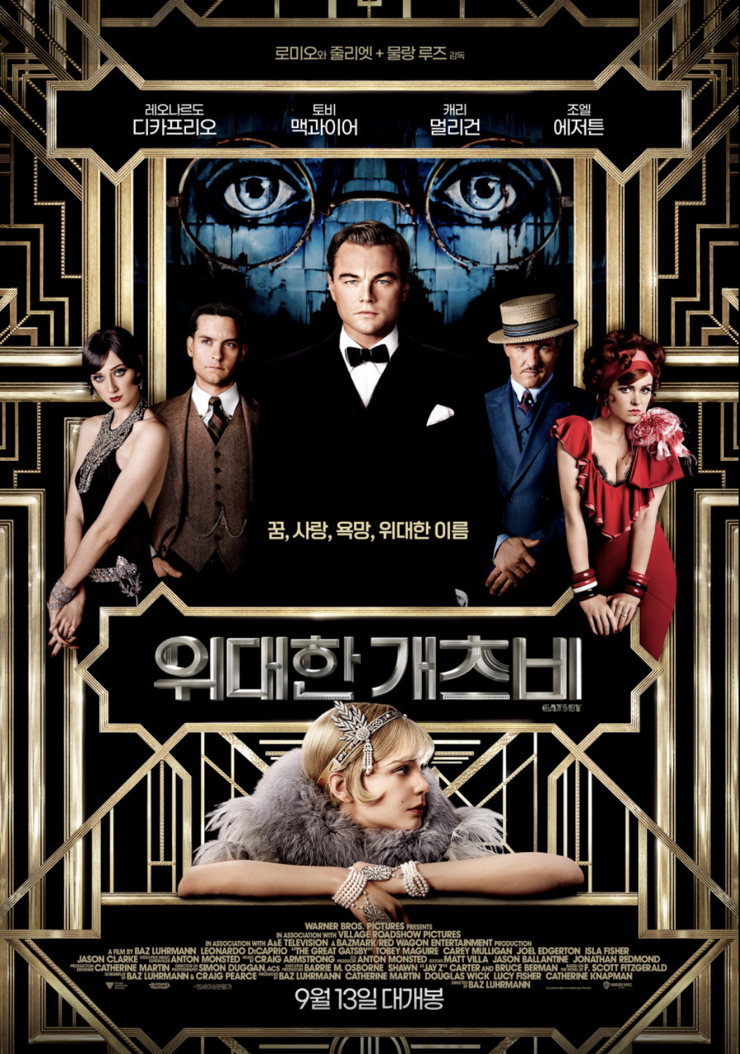 이 영화는 소설을 원작으로 탄생했습니다. 프랜시스 스콧 피츠제럴드가 1925년에 쓴 소설이자, 모디 딕과 더불어 미국을 대표하는 고전 소설 중 하나입니다. 흔히, 위해한 미국 소설'의 대표적인 소설 중 하나로 여겨집니다. GAN이라고도 불리기도 합니다. 금부법이 시행되고 재즈가 유행하던 광란의 20년대의 미국 뉴욕을 배경으로 하는 소설로 제1차 세계 대전의 승리 이후 물질적으로는 엄청난 풍요를 누리게 되었지만 도덕적으로 그리고 윤리적으로는 타락한 미국 사회의 치부를 드러내며 소위 아메리칸드림의 타락과 절망을 담은 소설입니다. 또한 당시 이러한 주제를 가지고 쓰인 소설들 중에서도 미국 고등학생의 필독서로 자리 잡은 몇 안 되는 소설이기도 합니다. 미국 랜덤하우스 출판사 편집위원회가 선정한 20세기 가장 위대한 영문 소설에서는 율리시스에 이어 2위를 차지한 바 있습니다. 디파프리오의 2013년작은 '바주 루어만' 감독 작품입니다. 역시 디카프리오와 함께 했던 '로미오와 줄리엣', 그리고 '물랑루즈' 등 영화와 뮤직비디오를 섞어 놓은 듯한 효과를 낼 정도로 현란하고 화려한 스타일로 시선을 압도하는 매력이 있습니다. 데이지 역의 '캐리 멀리건'은 외모로만 따진다면 캐스팅이 좀 아쉽지만 살짝 소년 같은 면모를 가진 디카프리오는 그 특유의 역대금 미소로 이미 게임이 끝나버렸고 닉 역의 '토비 맥과이어'와 톰 역의 '조엘 에저튼'도 아주 좋은 싱크로율을 보여줍니다. 영화의 경우 각본에 정말 고심해서 제작했다는 것을 알 수 있었습니다. 이 작품이 미국문학에서 차지하는 위상에 대한 예우랄까 그런 어떤 무게감 때문인지 최대한 원작을 훼손하지 않고 웬만하면 소설을 그대로 영상으로 옮기려고 한 노력이 느껴졌고 내용을 임의 바꾸거나 없는 부분을 만들어 추가한 장면은 거의 찾아볼 수가 없습니다. 이러한 행동과 결과들이 더욱더 영화를 대단한 소설과 영화로 귀하게 여기는 것 같아 더욱더 집중하게 만드는 것 같습니다.