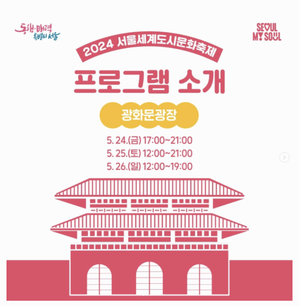2024 서울세계도시문화축제 자세한 내용은 아래 공식인스타그램 링크를 통해 바로 확인해보시기 바랍니다.