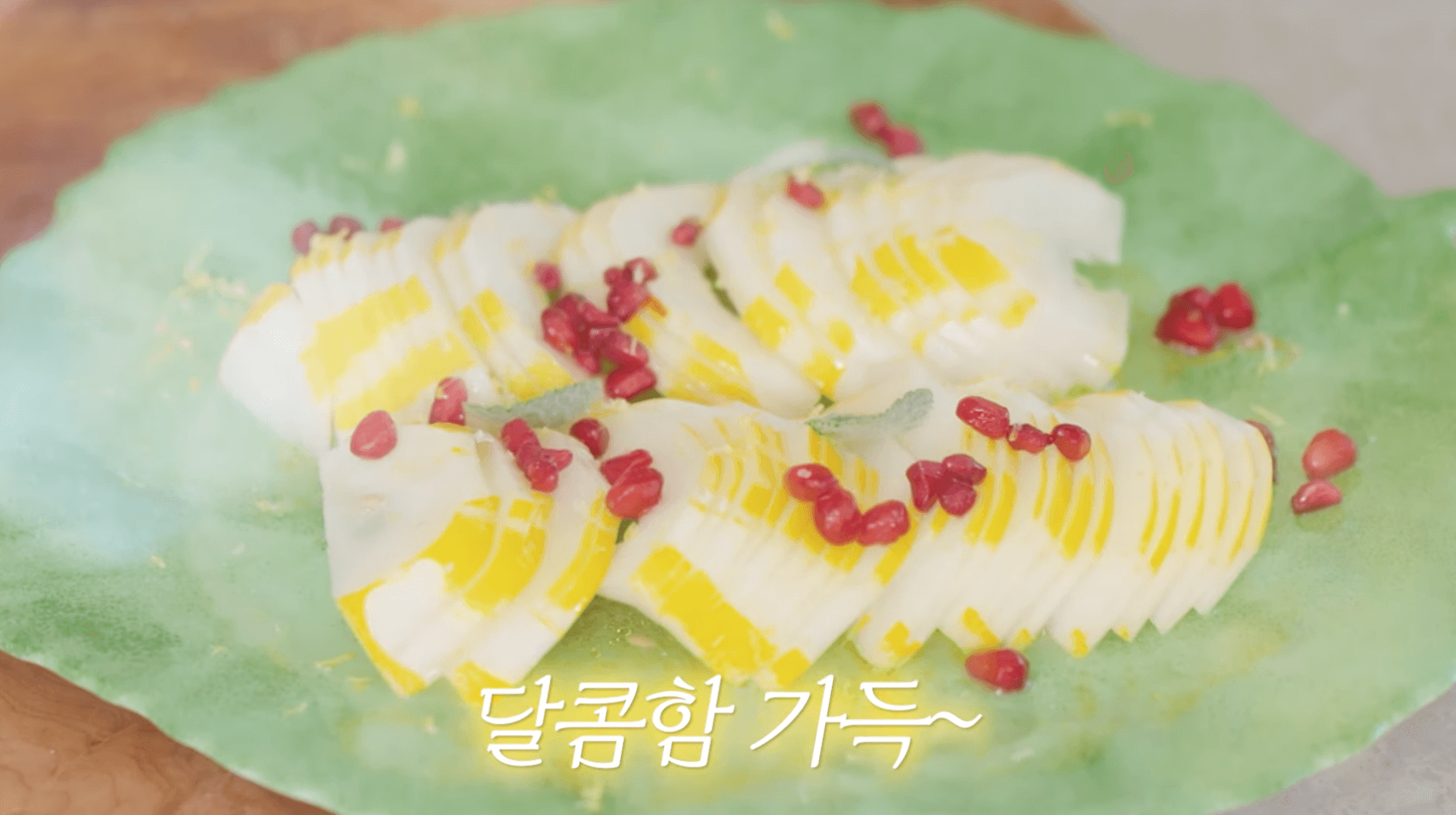 이번에도 최화정님의 터치로 좀 더 색다른 샐러드가 탄생했는데요. 석류와 레몬제스트!! 레몬제스트는 식감과 상큼함을 더하고 석류는 새콤함을 배가 시켜 샐러드 맛 엄청나게 기대되는데요! 40대 이후부터 석류는 여성에게 매우 좋은 과일이죠. 근데 이렇게 플레이팅 해놓으니 너무 아름답네요 보는 내내 미소를 머금고? 영상을 시청했어요. ㅎㅎ 색감이 너무 이뻐요. 참외샐러드를 먹으며 기분까지 리프레쉬~ 너무 좋을 것 같아요!